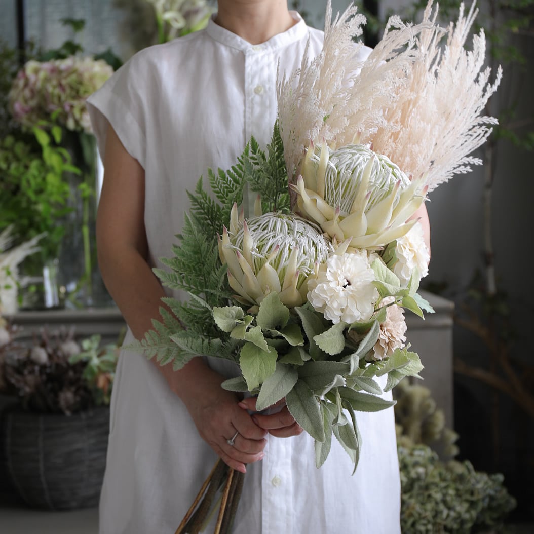 パンバスにプロテア。ベージュ系の花・くすみグリーンを合わせて、全体的に白からベージュの色合いで。大きなブーケですが、落ち着いた配色なので、軽やかにドレスと合わせていただけるはず。